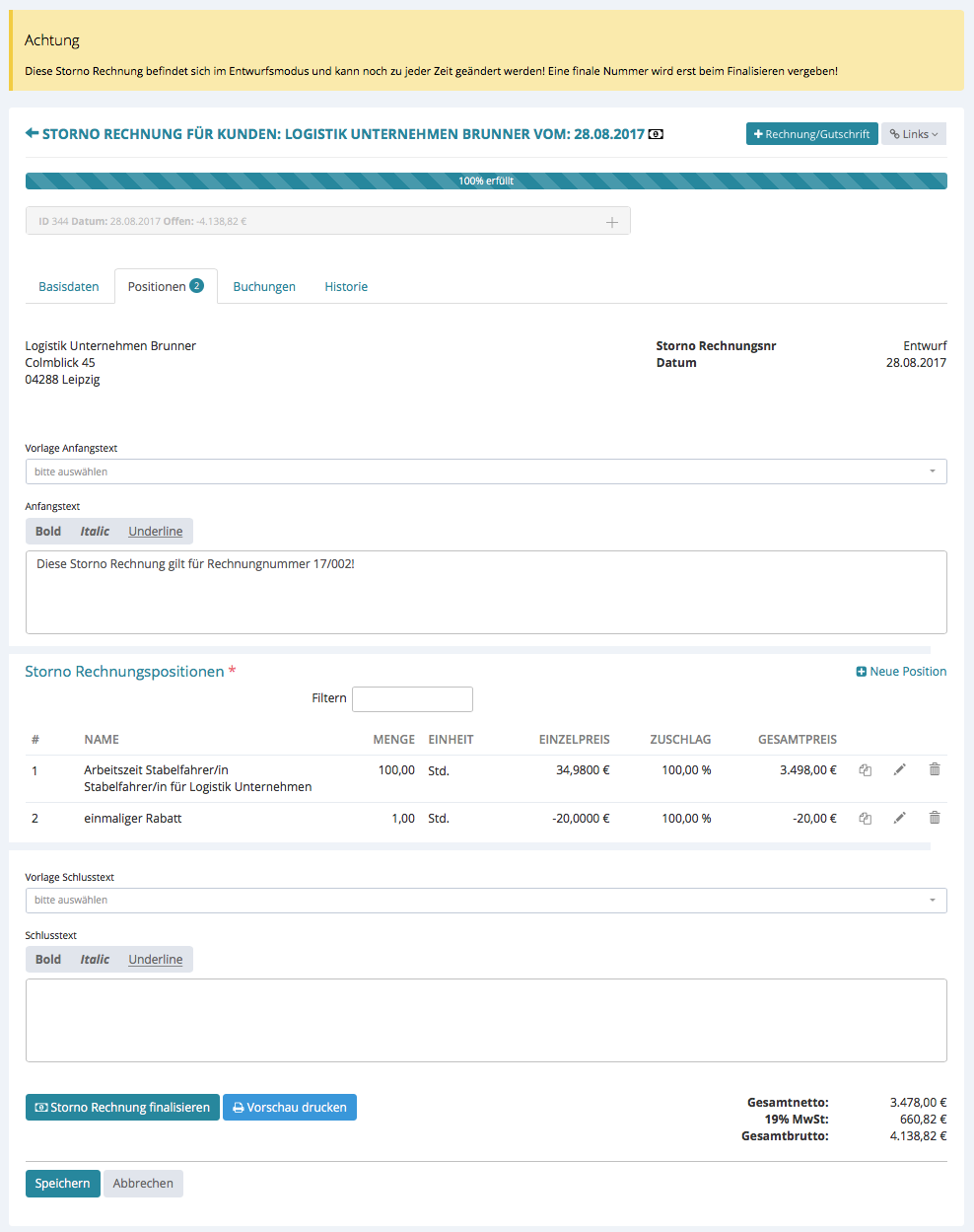 Die Storno Rechnung befindet sich im Entwurfsmodus und Sie können unter Positionen die Storno Rechnung bearbeiten. Dies ist identisch wie bei Rechnung/Gutschrift: Positionen.