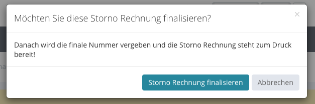 Mit einem Klick auf den Button „Storno Rechnung finalisieren“ wird noch einmal gefragt, ob die Storno Rechnung finalisiert werden soll.