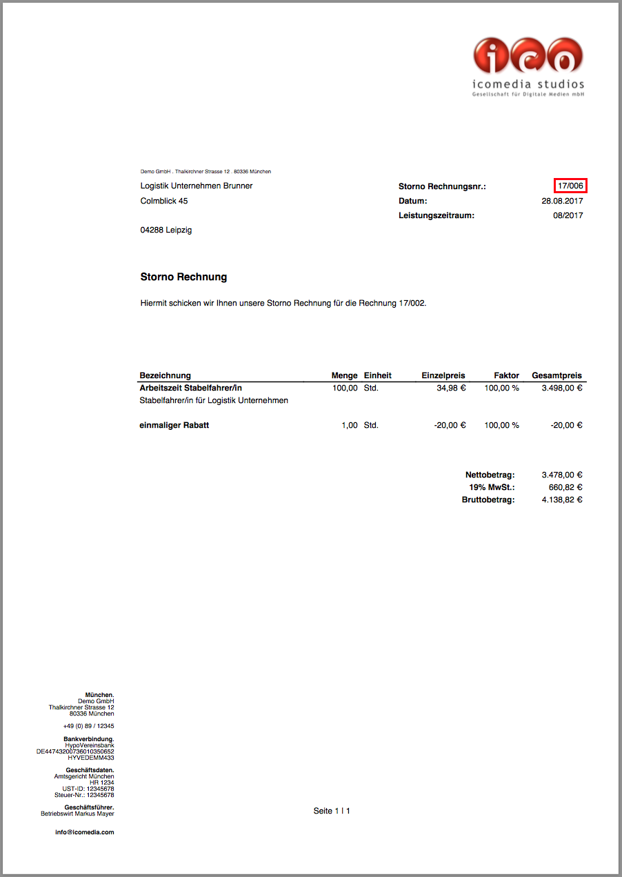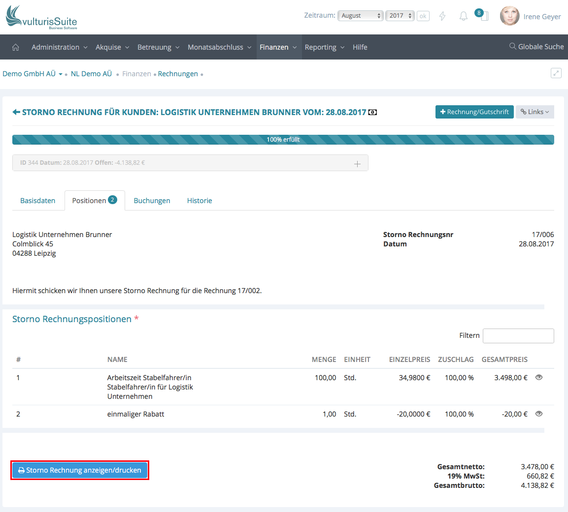 Mit einem Klick auf den Button „Storno Rechnung anzeigen/drucken“ erscheint die fertige Storno Rechnung.