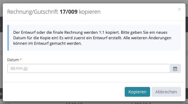 Mit einem Klick auf den Button „Kopieren“ gelangen Sie auf die Basisdaten. Sie können jetzt so verfahren wie bei Rechnung/Gutschrift: Positionen.