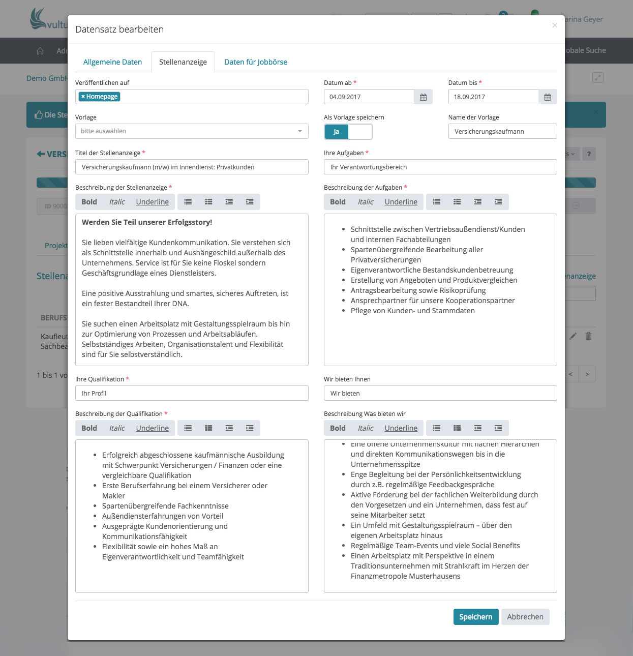 Sind bereits Vorlagen abgespeichert, können Sie aus denen wählen. Ein Klick auf die Vorlage lädt den Inhalt der Stellenanzeige. (Titel und Beschreibung der Stellenanzeige, Aufgaben, Qualifikation und Was bieten wir)