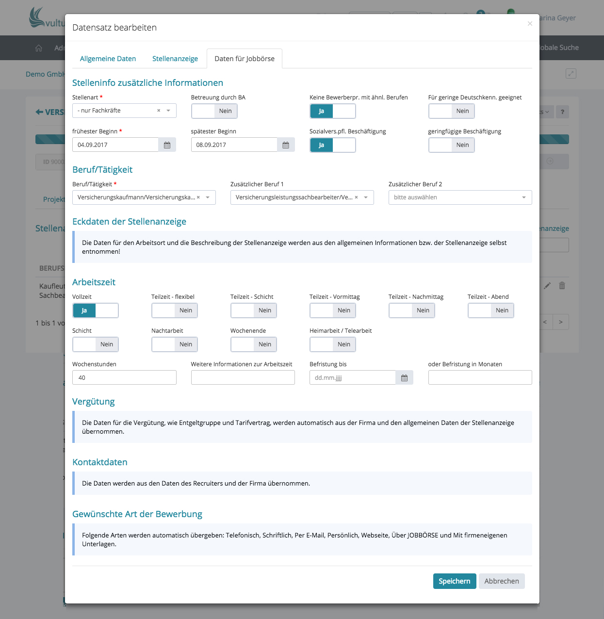 Füllen Sie nun die Stellenanzeige aus. Diese besteht aus drei Rubriken, Allgemeine Daten, Stellenanzeige und Daten für die Jobbörse.