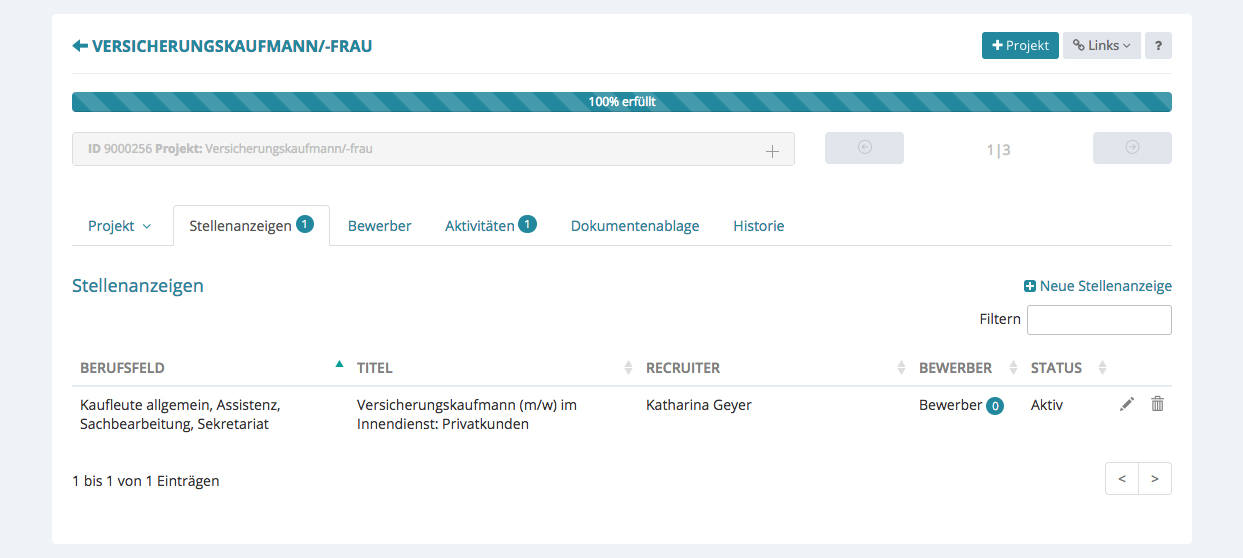 Es wird Ihnen jetzt auf dem Reiter „Stellenanzeigen“ die Anzahl der hinterlegten Anzeigen aufgezählt, zusätzlich wurde die Aktion bei Aktivitäten hinterlegt.