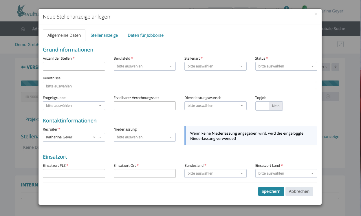 Speichern Sie jetzt noch nicht, erst müssen noch die Daten in Stellenanzeige ausgefüllt werden. Gehen Sie jetzt auf den Tab „Stellenanzeige“. Ihre Daten in den allgemeinen Daten“ gehen dabei nicht verloren.