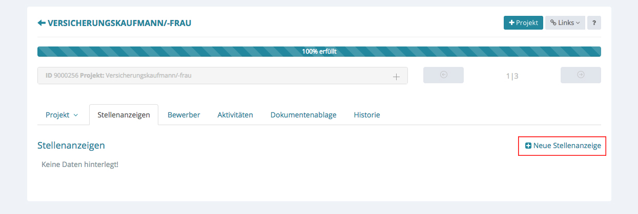 Für umfangreichere Projekte, z.B. eine Filial-Eröffnung eines Kunden, werde zu einem bestimmten Zeitpunkt gleich mehrere unterschiedliche Stellen ausgeschrieben. Fügen Sie dann einfach alle nötigen Stellenanzeigen bei diesem Projekt zu.