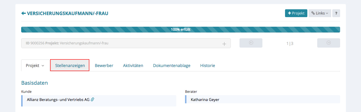Klicken Sie bei Projekte auf den Reiter „Stellenanzeige“.