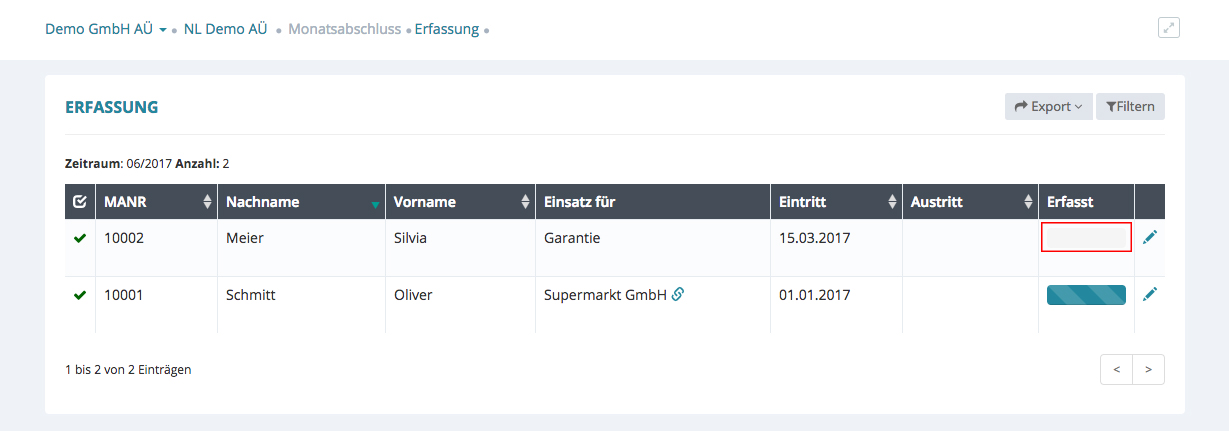 In dieser Übersicht ist der Beispiel-Mitarbeiter Oliver Schmitt zu 100% erfasst. Das sehen Sie an dem vollständig gefüllten Balken, in der Spalte „Erfasst“.