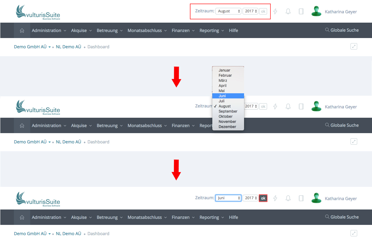 Als erstes ist es wichtig den gewünschten Zeitraum des Monatsabschlusses auszuwählen. Klicken Sie dazu in den Monat des Zeitraumes und wählen den gewünschten Monat aus dem Drop-Down-Menü aus. Sind Monat und Jahr ausgewählt, dann klicken Sie auf „ok“. Danach befinden Sie sich in diesem Zeitraum.