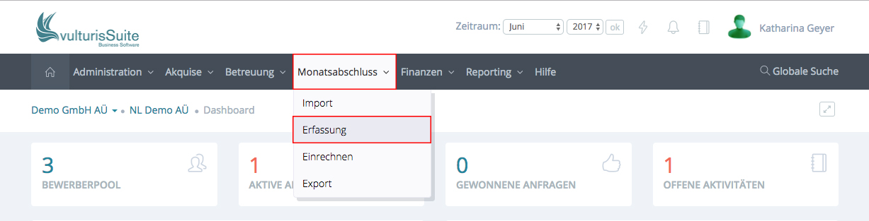 Um zu der Übersichtsseite der erfassten Mitarbeiter zu gelangen, klicken Sie bitte auf der Startseite in der Menüleiste auf Monatsabschluss -> Erfassung.