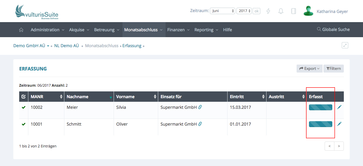 In dieser Übersicht ist der Beispiel-Mitarbeiter Oliver Schmitt zu 100% erfasst. Das sehen Sie an dem vollständig gefüllten Balken, in der Spalte „Erfasst“.