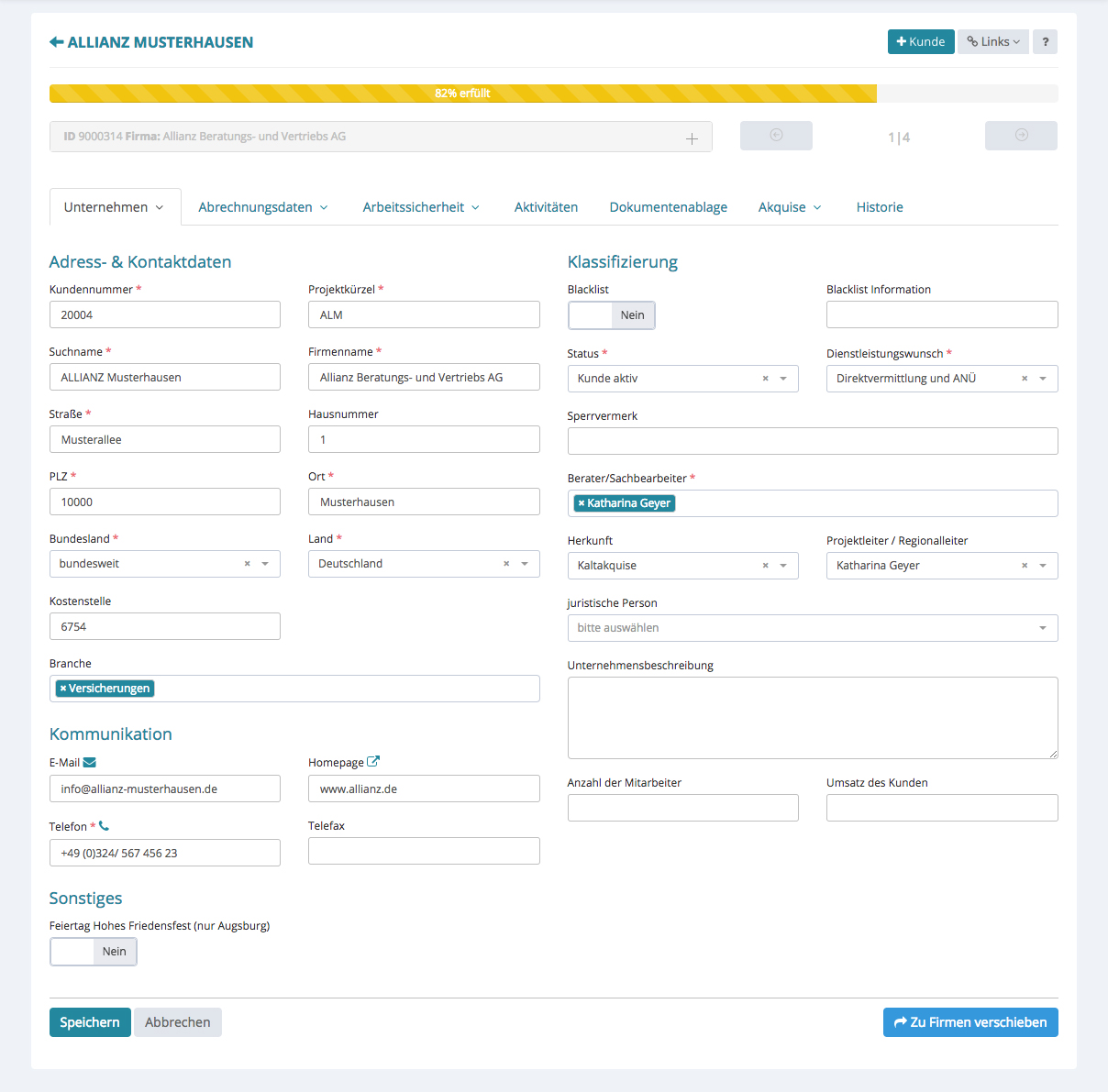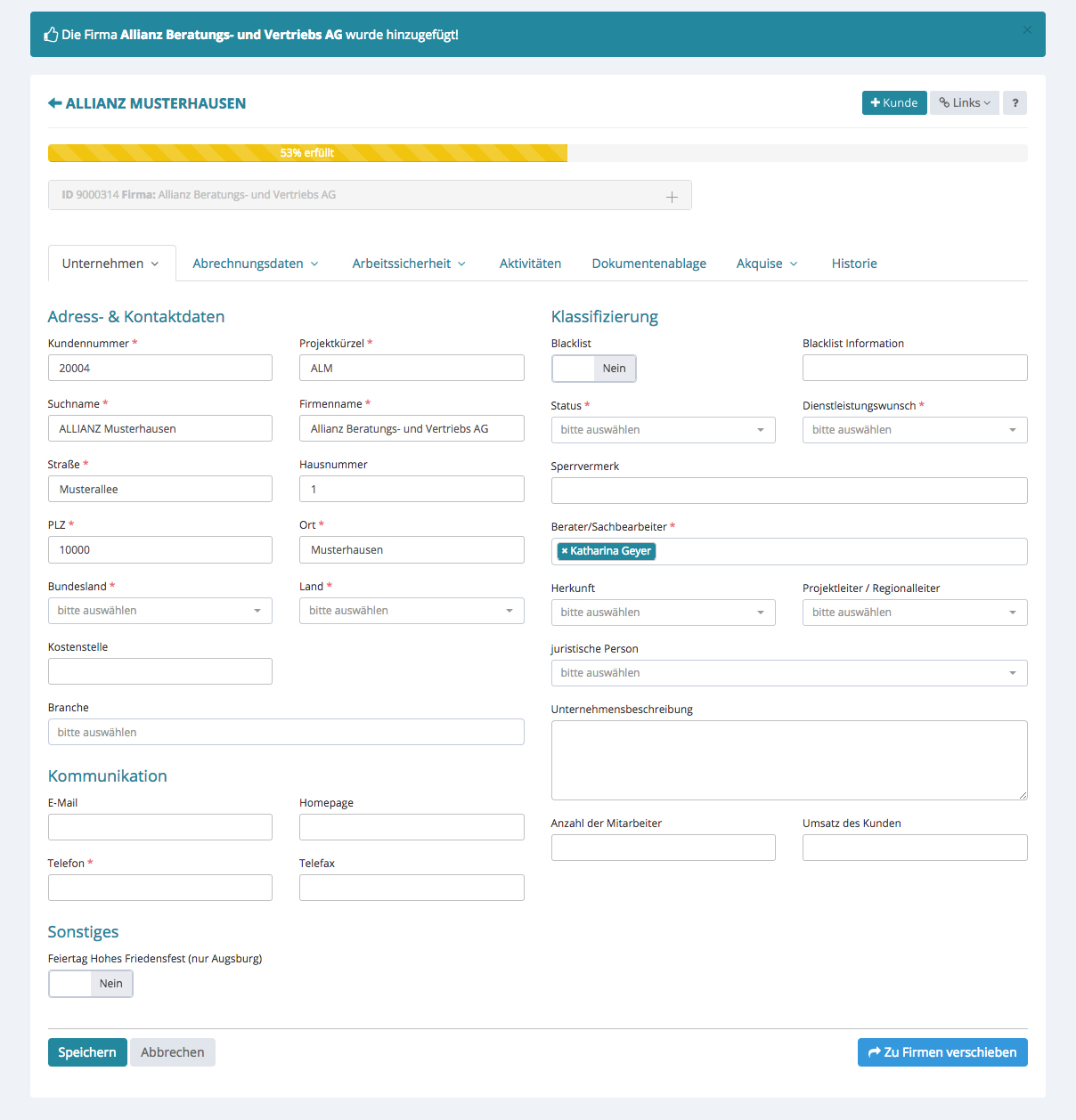 Oftmals sind Firmen Tochterunternehmen anderer Firmen. Um hier den Überblick zu behalten, kann man das zugehörige Unternehmen eintragen.