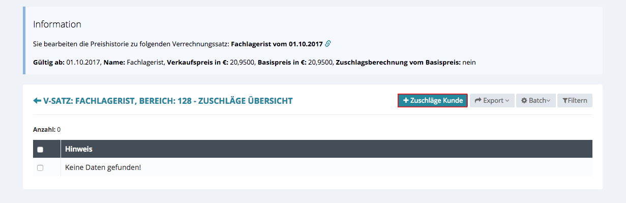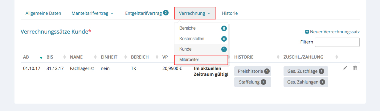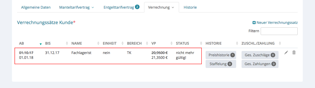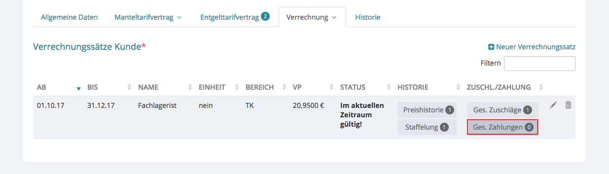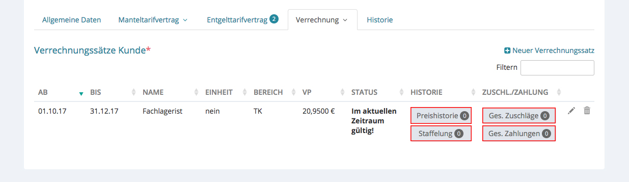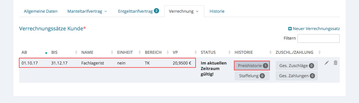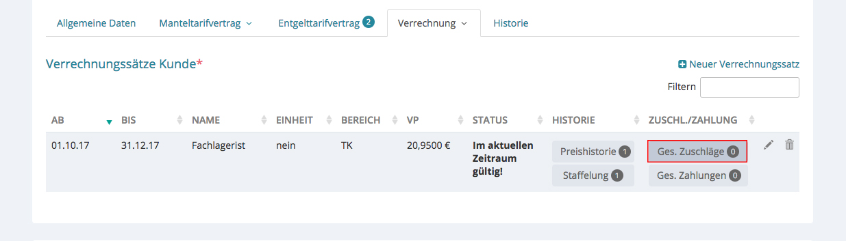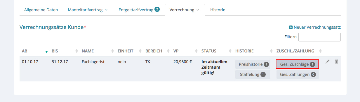 Hier werden Ihnen wieder die Spalten Historie und Zuschläge/Zuzahlungen angezeigt, die Sie genauso pflegen und bearbeiten wie in den Verrechnungssätzen des Kunden.