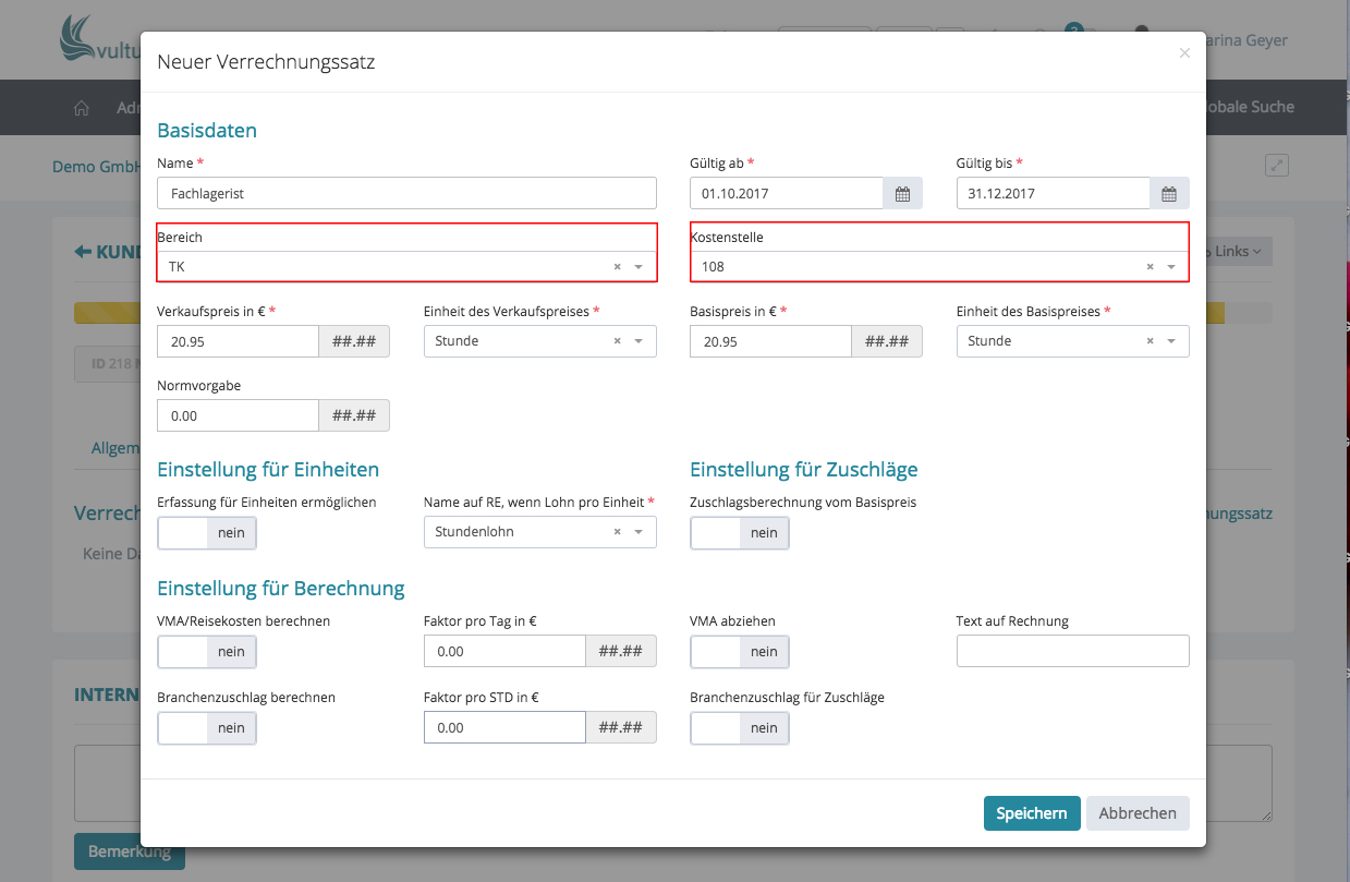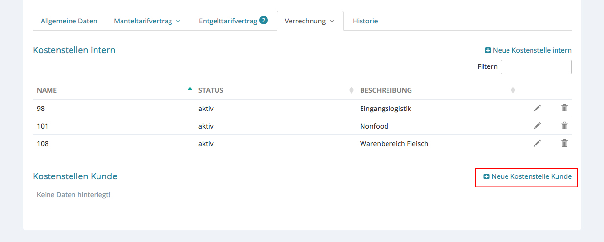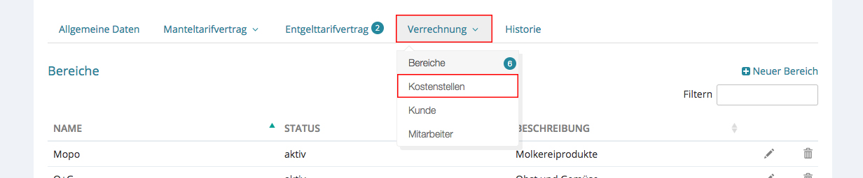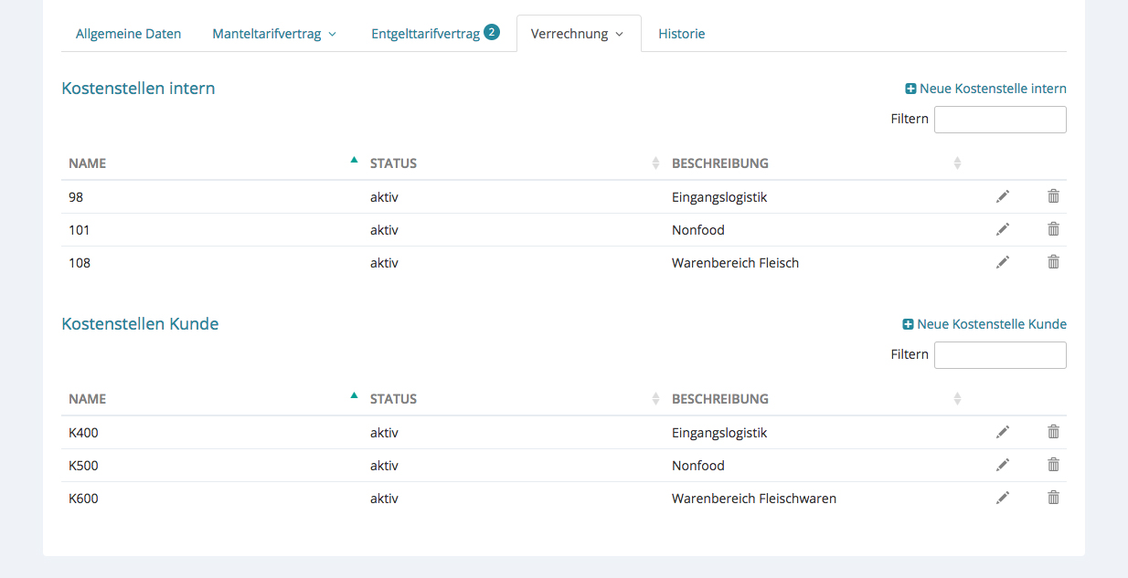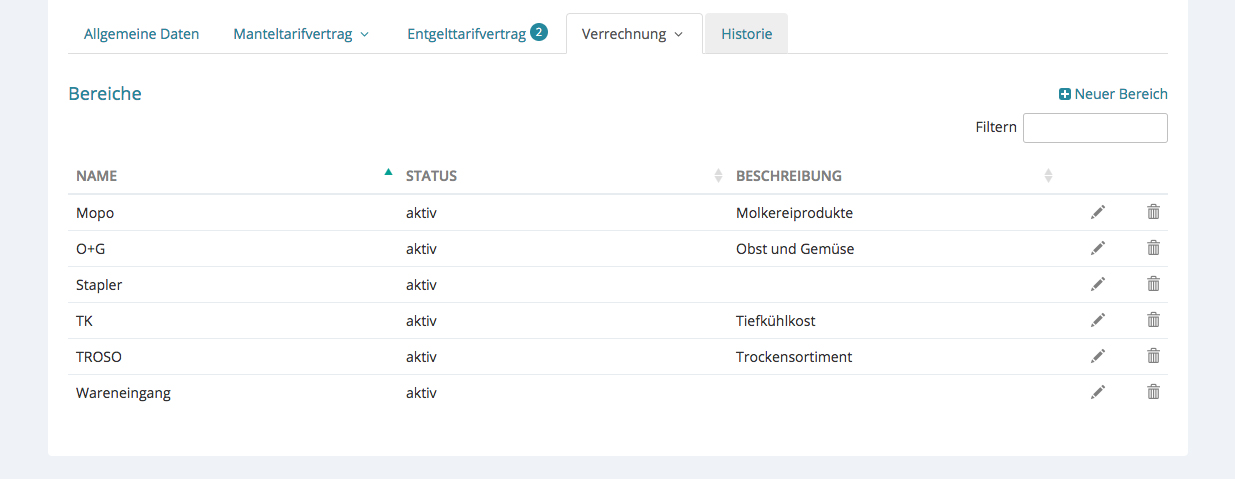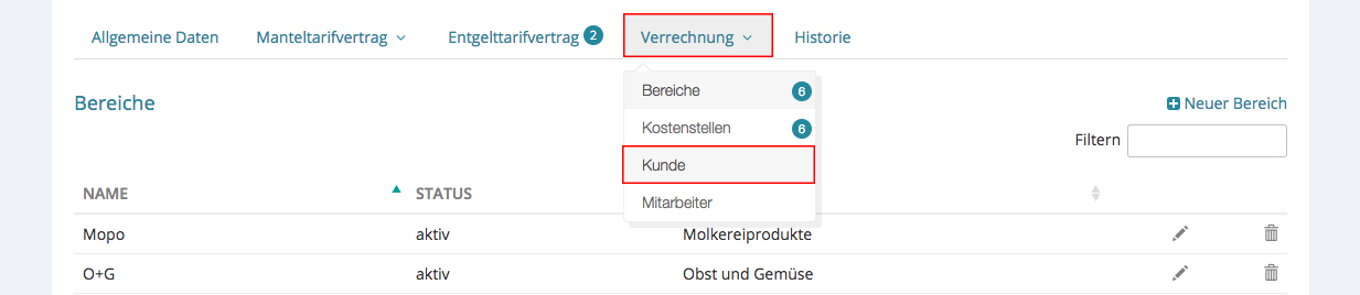 Handelt es sich bei dem Kunden z.B. um einen Supermarkt, braucht dieser Mitarbeiter in verschiedenen Bereichen und zahlt z.B. Prämien oder extra Zuschläge. Diese Bereiche sind später wichtig für die Verrechnungssätze Kunde.