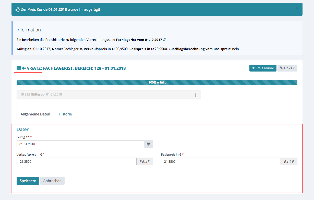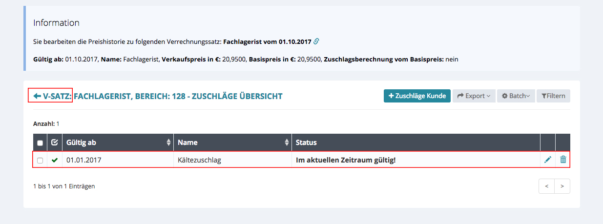 Um zur Übersicht der Verrechnungssätze Kunde zurück zu kehren klicken Sie auf den Pfeil vor <- V-Satz.