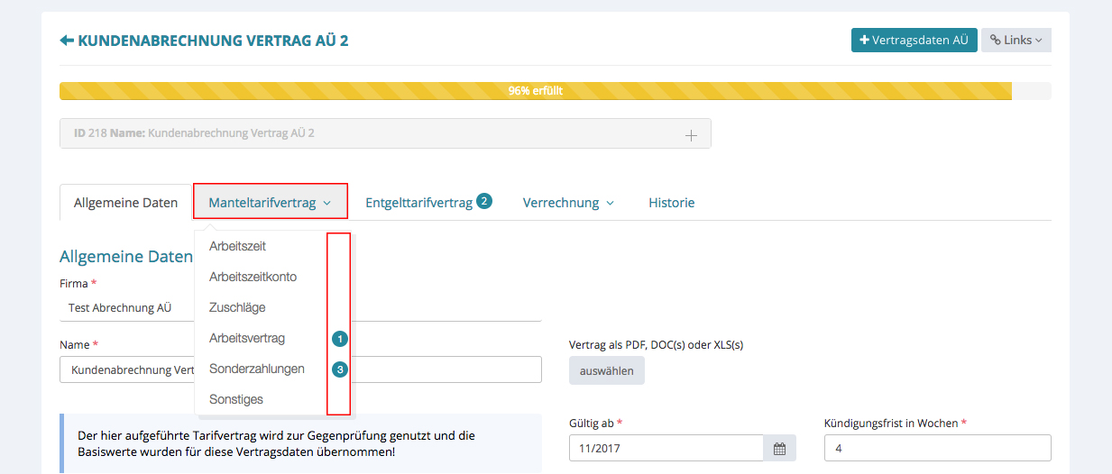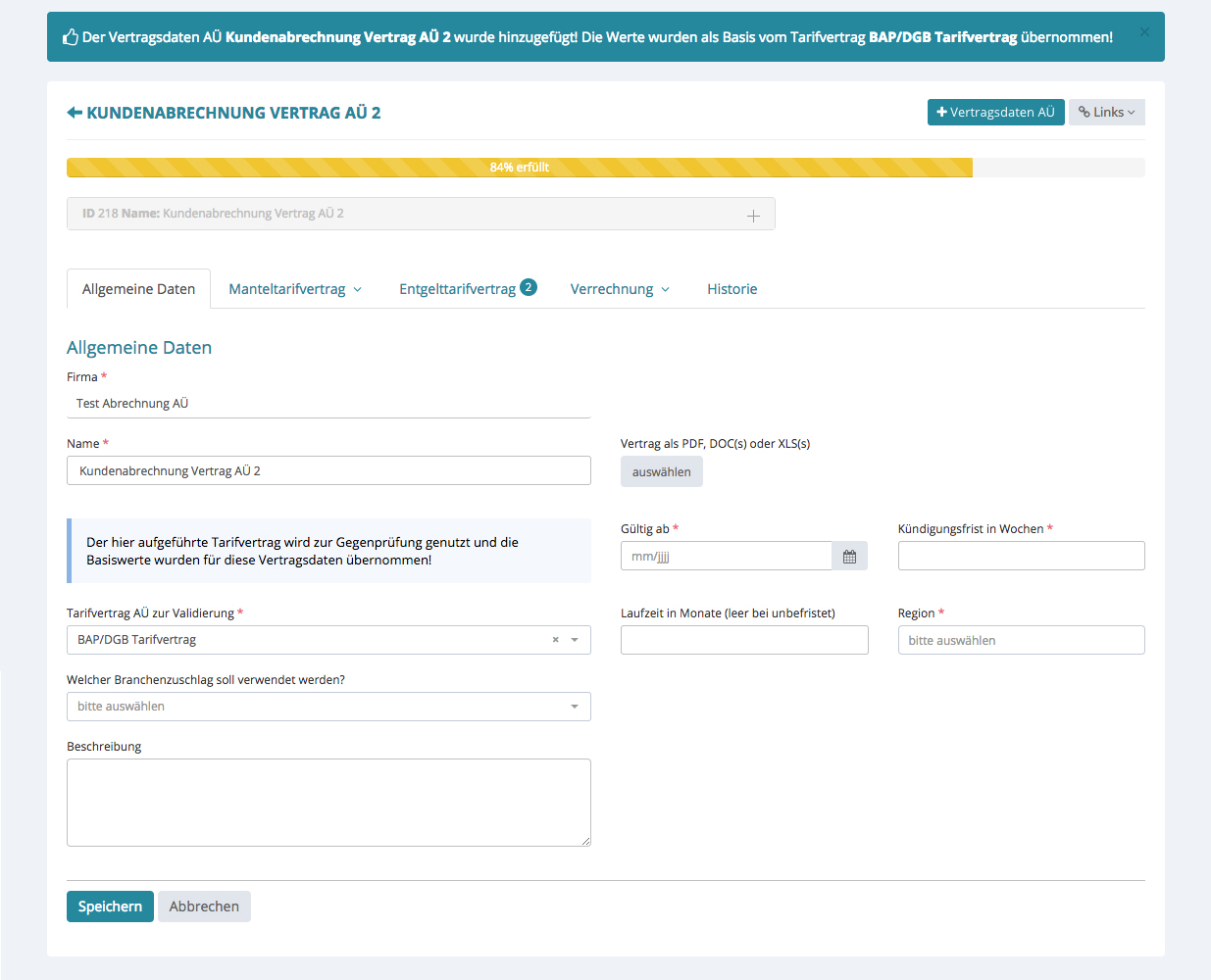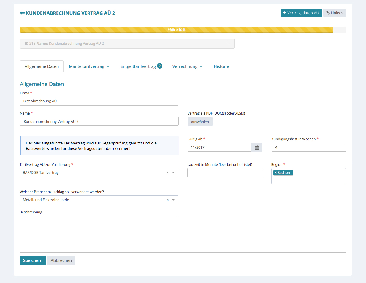 Haben Sie diese Einträge vorgenommen bitte speichern und schon sind Sie bei 96%. Das kommt daher, das viele Einträge aus dem ausgewählten Basis-Tarifvertrag vererbt wurden.