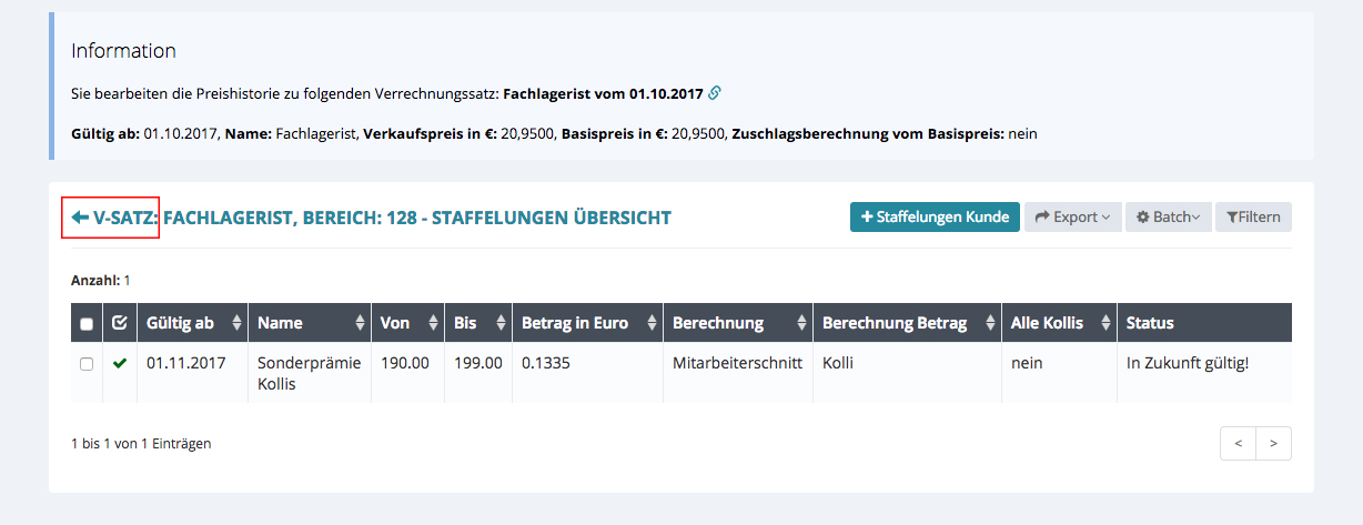 Sie können nun mit einem Klick auf den Pfeil zurück zur Übersicht der Staffelung. Oder Sie klicken auf das Menü-Icon (drei Striche vor dem Pfeil) direkt zum Verrechnungssatz zurückgehen.