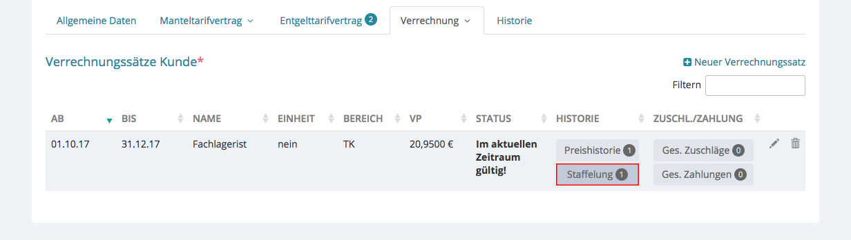Hinter Staffelung erscheint nun eine eins. Mehr bekommen Sie davon in der Übersicht des Verrechnungssatzes nicht angezeigt, auch nicht in Zukunft. Denn ausschlaggebend ist nur die Preishistorie.