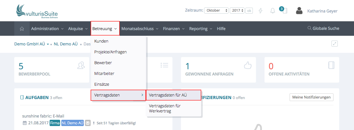 Um neue Vertragsdaten für z. B. für die Arbeitnehmerüberlassung anzulegen klicken Sie bitte in der Menüleiste auf Betreuung-> Vertragsdaten –> Vertragsdaten für AÜ. Das gleich geht natürlich auch für Werkvertrag, dazu wählen Sie dann Vertragsdaten für Werkvertrag aus. In unserem Beispiel bleiben wir bei einem Kundenvertrag für die Arbeitnehmerüberlassung.