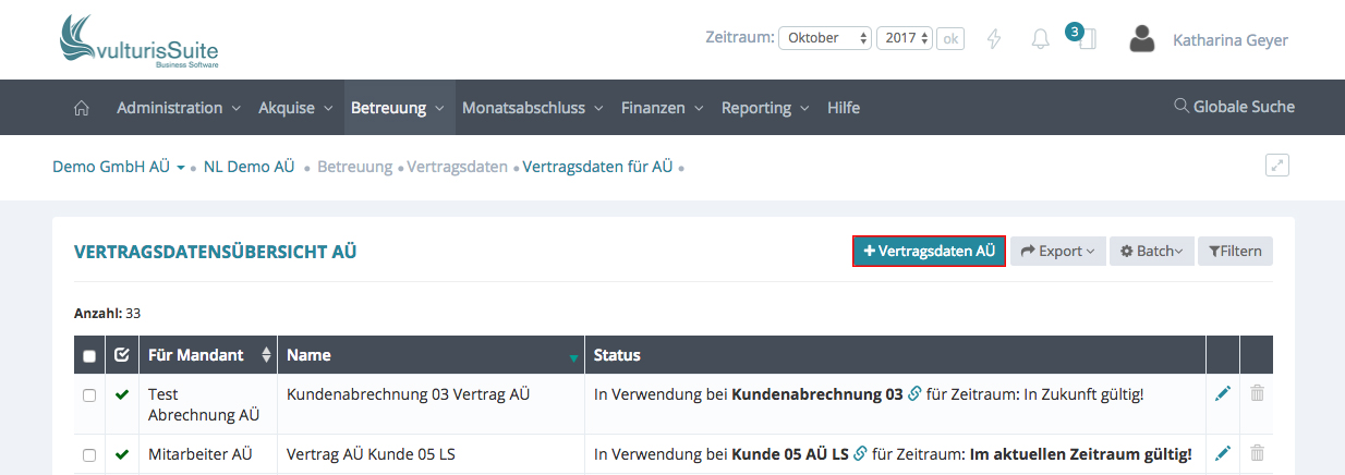 Die VERTRAGSDATENÜBERSICHT erscheint. Hier werden alle bis dahin eingetragenen Vertragsdaten angezeigt.