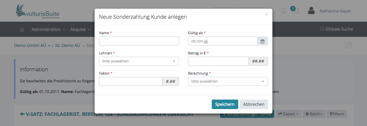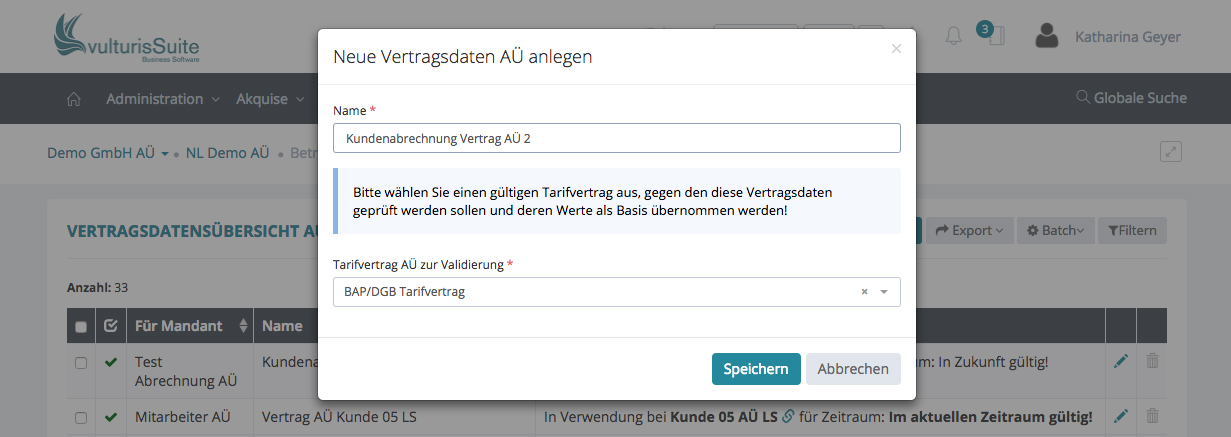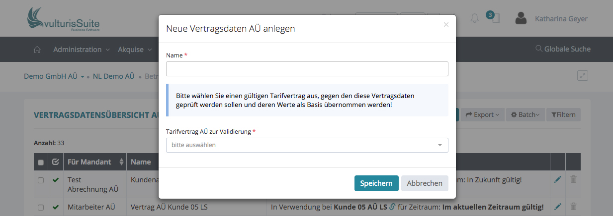 Ein Klick auf den Button „+ Vertragsdaten AÜ“ und ein Schnelleingabefenster erscheint.