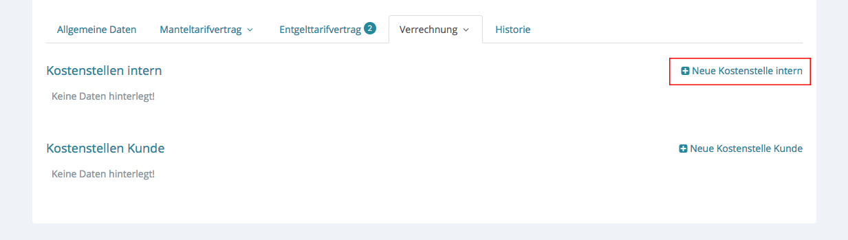 Klicken Sie nun unter Verrechnung auf Kostenstelle und im Anschluss auf „+ Neue Kostenstelle intern“.