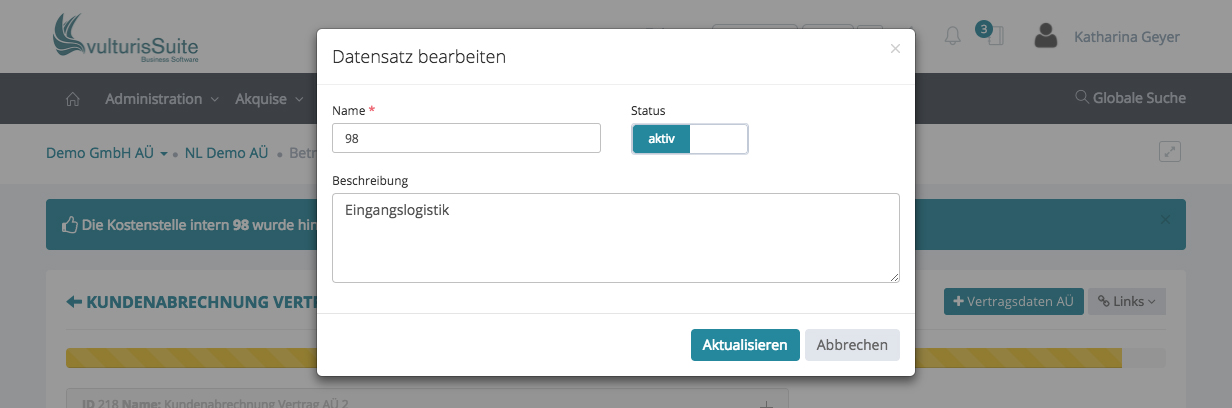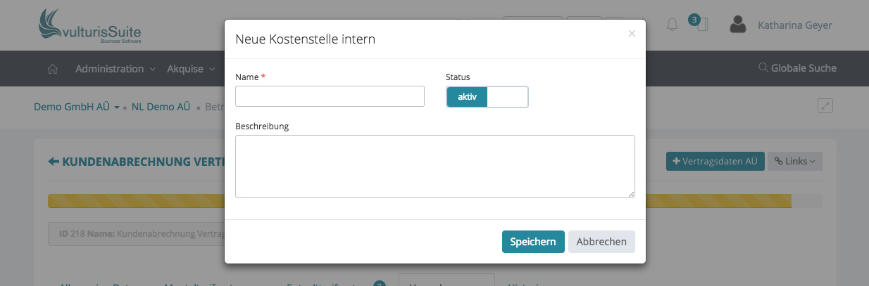 Tragen Sie den Namen der Kostenstelle ein, meistens handelt es dabei um Zahlen. Diese Kostenstellen sind später wichtig für die Verrechnungssätze des Kunde.