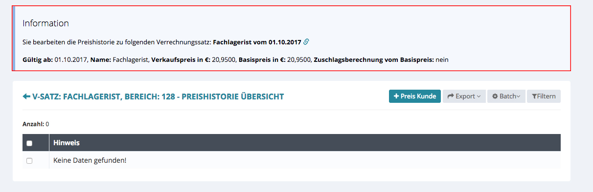 Die Preishistorie zeigt Ihnen an, wie sich der Preis im Laufe der Zeit entwickelt hat. Ein Klick auf Preishistorie und die Übersicht erscheint. Am Anfang ist diese natürlich leer. Klicken Sie einmal auf Preishistorie. Oben im hellblauen Kästchen, sehen Sie eine Information, in welchem Verrechnungssatz Sie sich befinden. Füllen Sie sie, indem Sie auf „+ Preis Kunde“ klicken.
