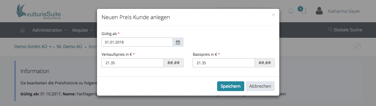Hier wurde eine Preiserhöhung eingetragen, die in Zukunft zum Tragen kommt.