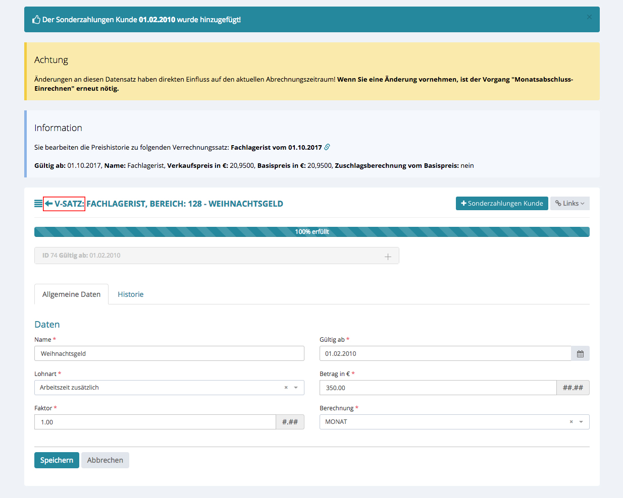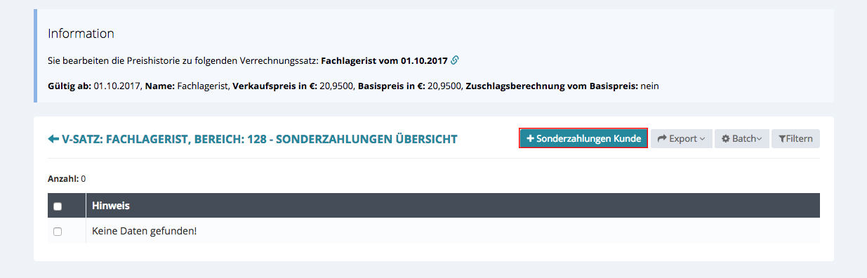 Legen Sie nun den Datensatz an, indem Sie auf „+ Sonderzahlungen Kunde“ klicken.