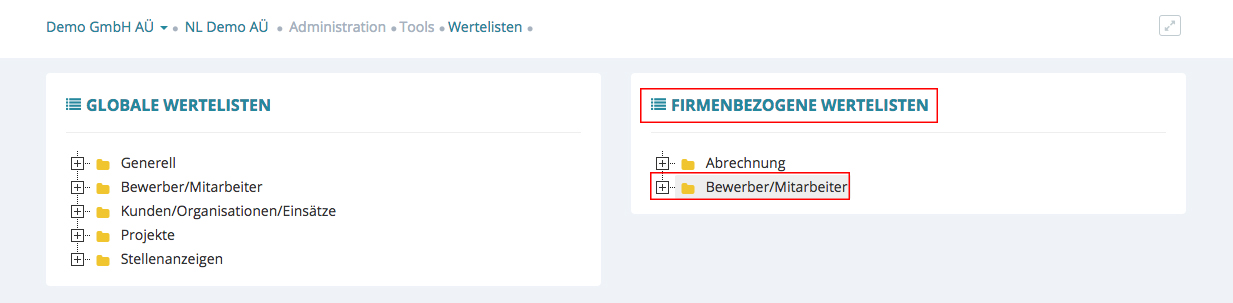 Die Seite Wertelisten erscheint. Aufgeteilt in globale und firmenbezogene Wertelisten.