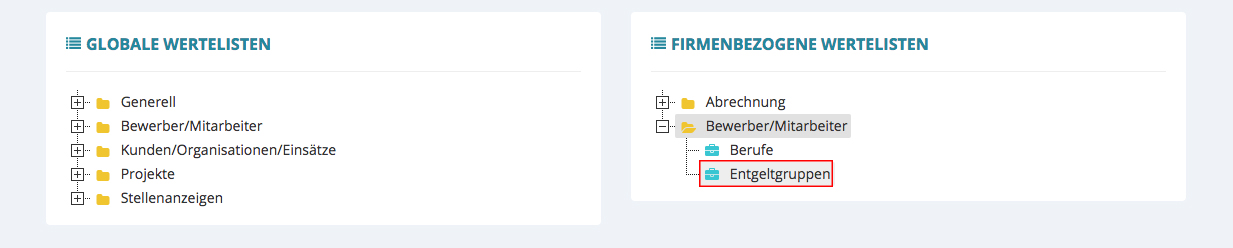 Bei einem Klick auf das Plus vor „Bewerber/Mitarbeiter“ öffnen sich der Dateiordner und sie können den Unterordner „Entgeltgruppen“ auswählen.