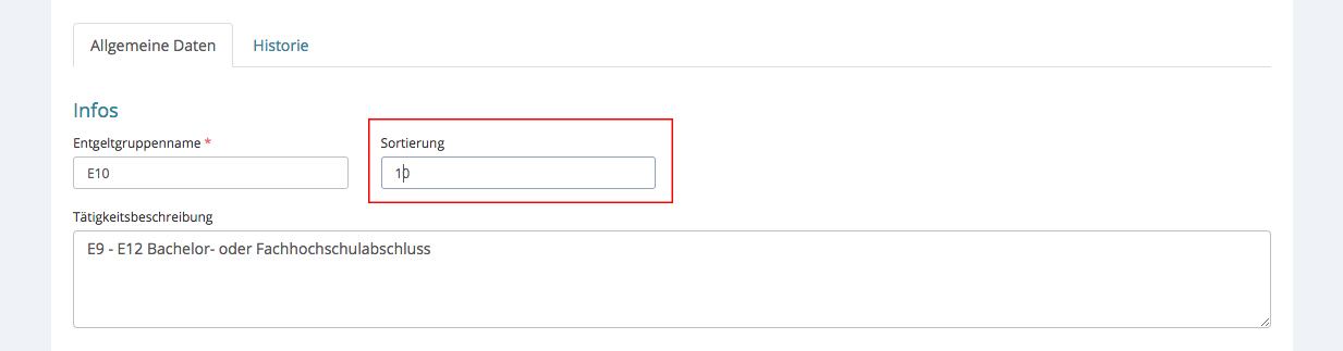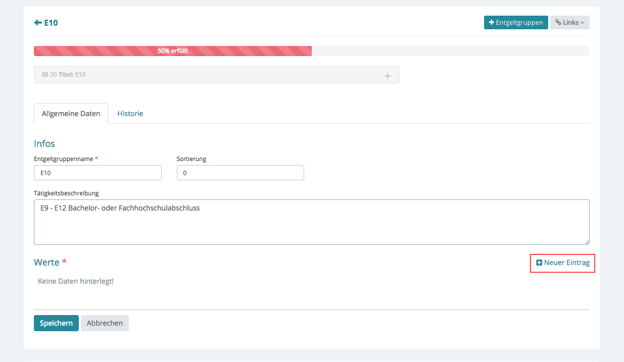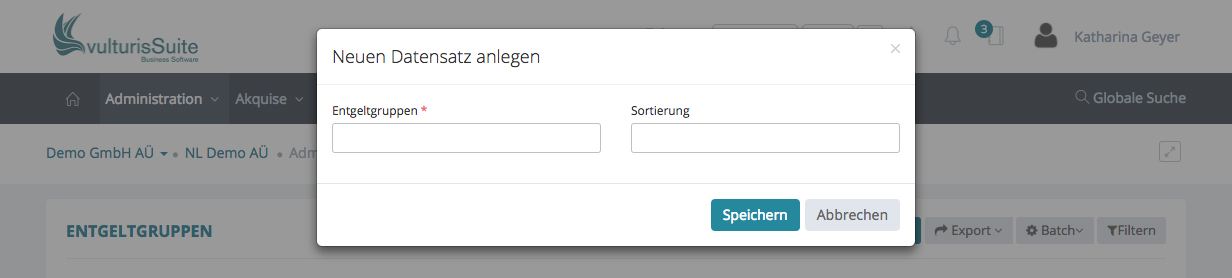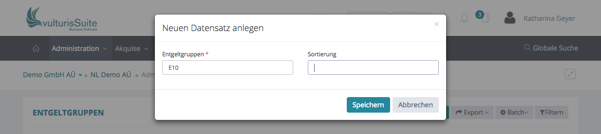 Möchten Sie eine neue Entgeltgruppe hinzufügen, klicken Sie bitte oben rechts auf „+ Entgeltgruppe“ und ein Schnelleingabefenster erscheint.