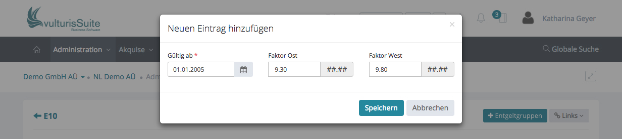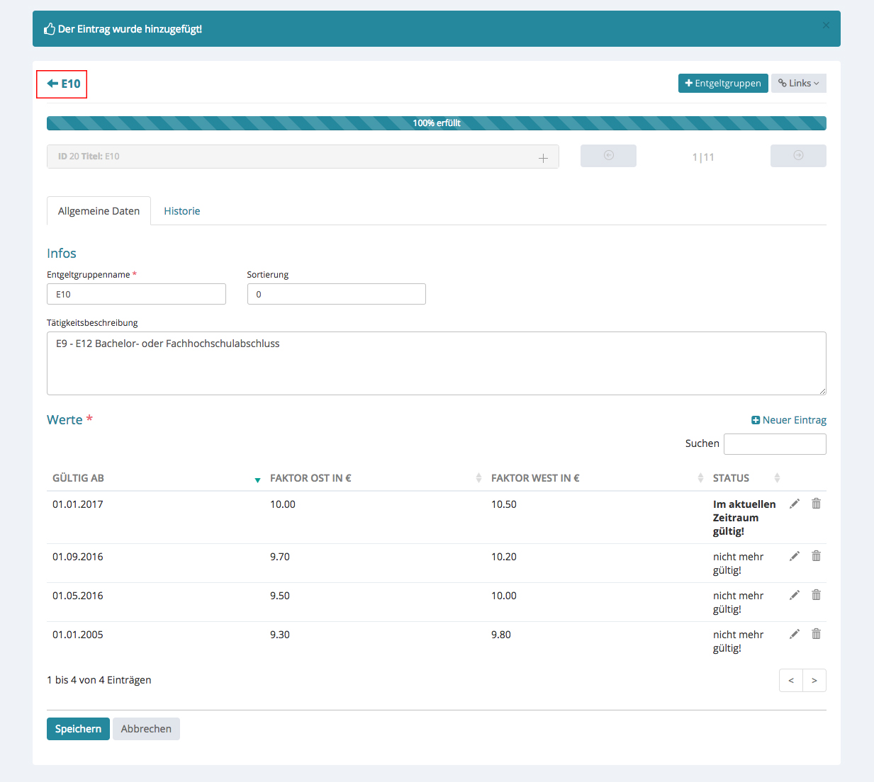 Geben Sie an, ab wann die Entgeltgruppe gültig ist und tragen Sie die Faktoren von Ost und West ein.