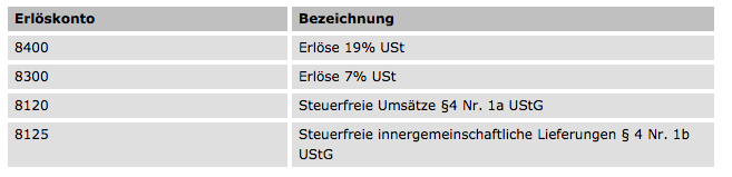Möchten Sie Ihre Rechnungen automatisiert – z.B. über die optionale DATEV-Schnittstelle – an eine Finanzbuchhaltung oder den Steuerberater übergeben, so ist es erforderlich, die vorgegebene Nr. einzutragen. Die Vorgabe, welche Erlöskonten verwendet werden müssen, trifft i.d.R. der Steuerberater oder die Buchhaltungsabteilung. Fragen Sie dort nach. Häufig findet in der Praxis der DATEV-Standardkontenrahmen Verwendung, von dem dann nur folgende Erlöskonten benutzt werden: