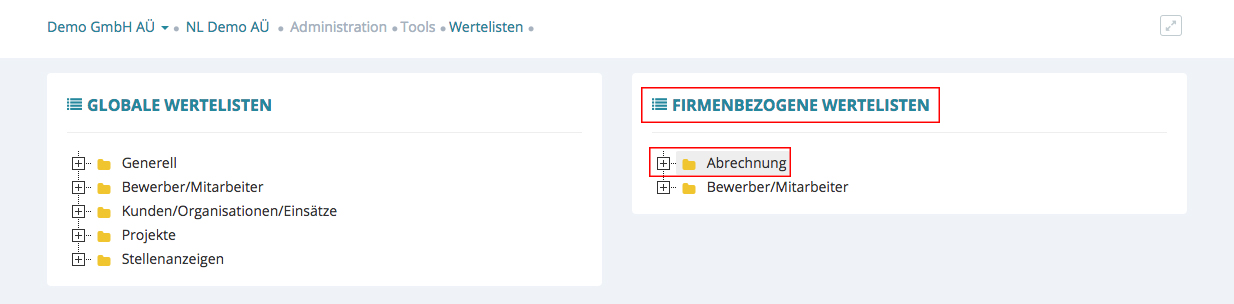 Die Seite Wertelisten erscheint. Aufgeteilt in globale und firmenbezogene Wertelisten.