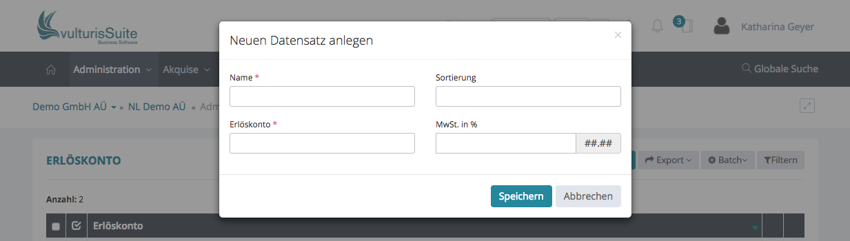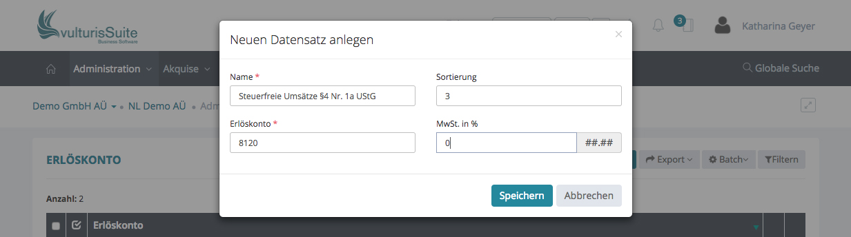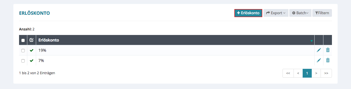 Möchten Sie eine neues Erlöskonto hinzufügen, klicken Sie bitte oben rechts auf „+ Erlöskonto“ und ein Schnelleingabefenster erscheint.