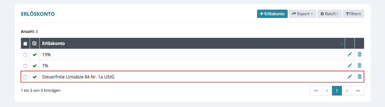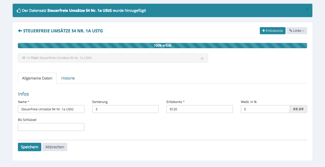 Wenn Sie auf den Pfeil vor „<- steuerfreie Umsätze …“ klicken, gelangen Sie zurück zur Übersicht.