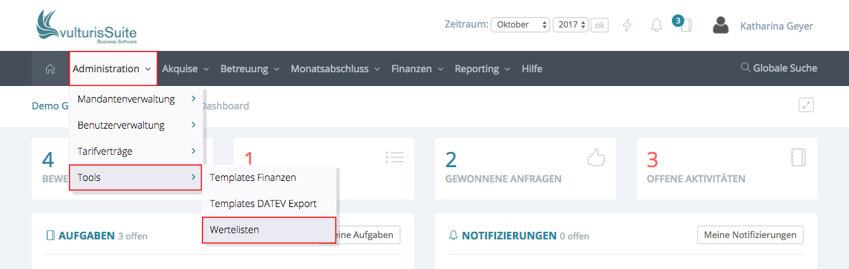 Um eine Werteliste zu bearbeiten, klicken Sie bitte auf der Startseite auf den Hauptmenüpunkt Administration -> Tools -> Wertelisten.