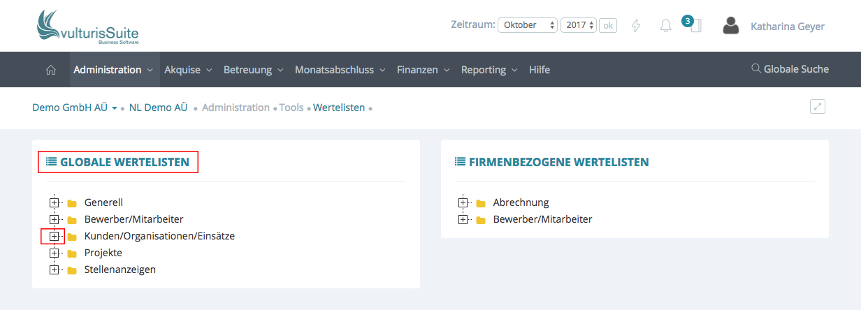 Die Seite Wertelisten erscheint. Aufgeteilt in globale und firmenbezogene Wertelisten.