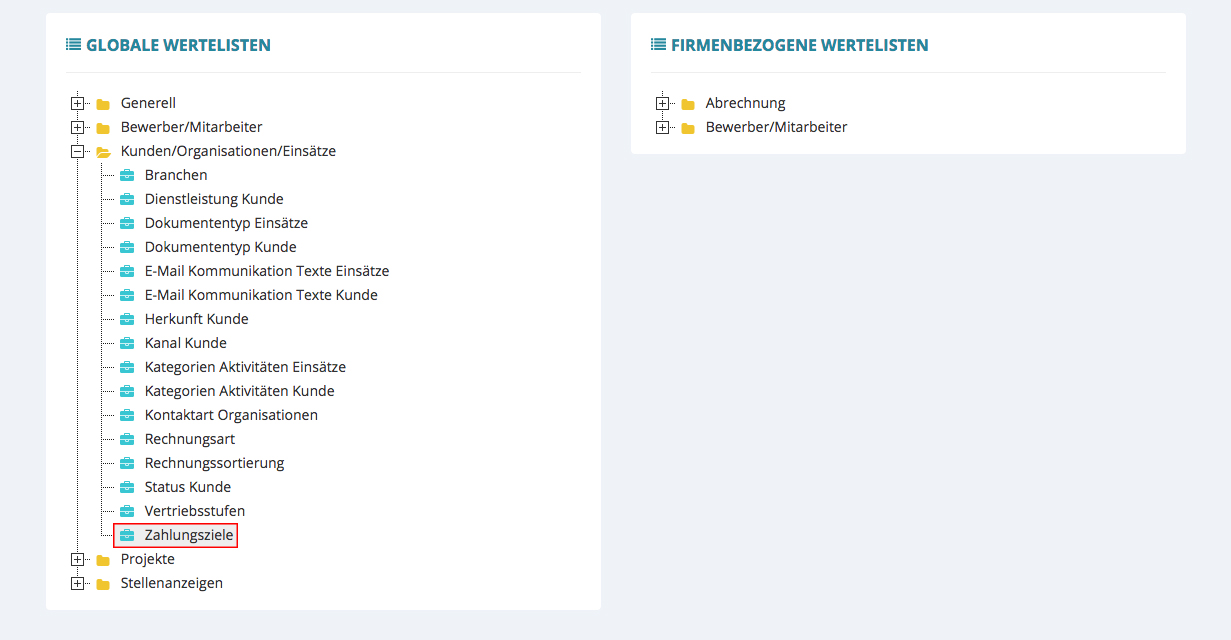 Die einzelnen Zahlungsziele werden in den Wertelisten hinterlegt.