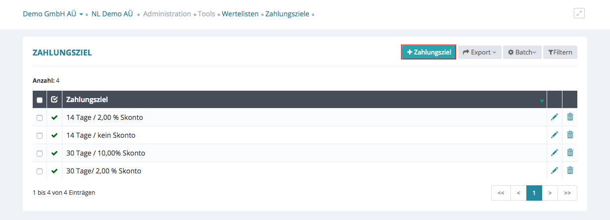 Mit einem Klick auf den Unterordner „Zahlungsziele“ gelangen sie direkt zu dessen Übersicht.
