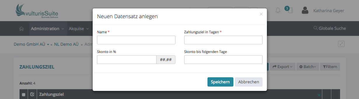 Möchten Sie ein neues Zahlungsziel hinzufügen, klicken Sie bitte oben rechts auf „+ Zahlungsziel“ und ein Schnelleingabefenster erscheint.