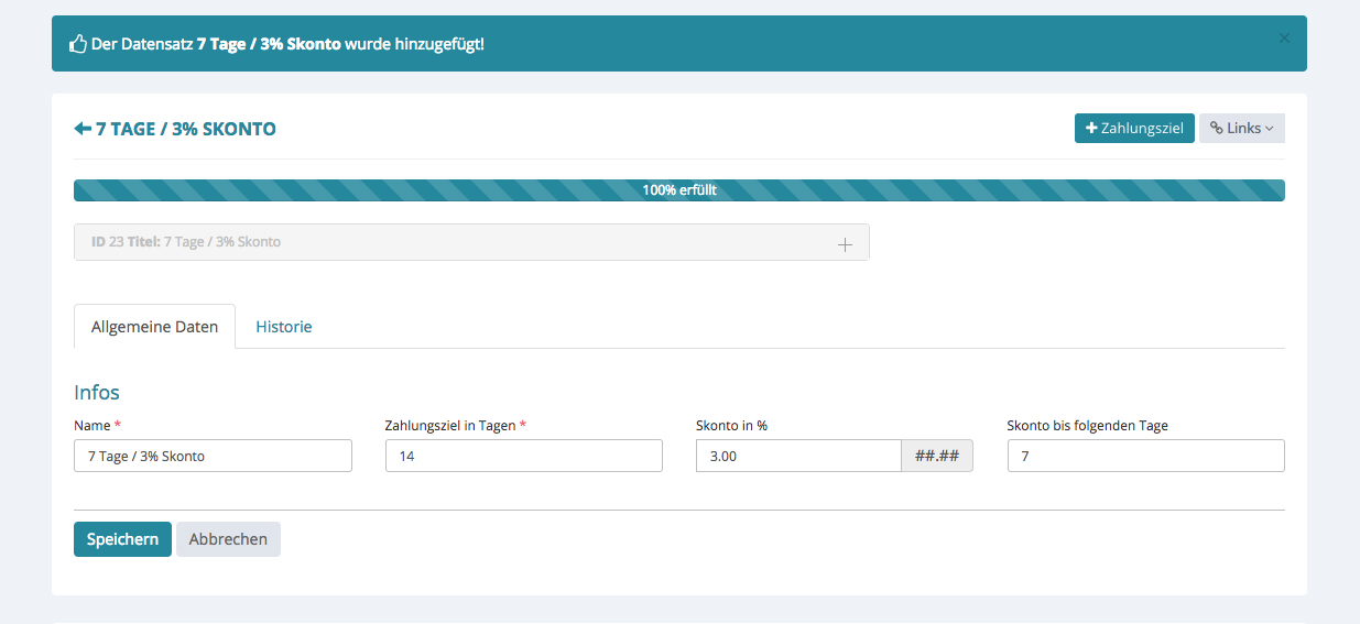 Füllen Sie dieses bitte aus. Tragen Sie das normale Zeitfenster ein, idem bezahlt werden soll unter „Zahlungsziel in Tagen“. Tragen Sie unter „Skonto bis folgende Tage“ das Zeitfenster ein, indem der Kunde bei Zahlungseingang einen Skonto erhält.