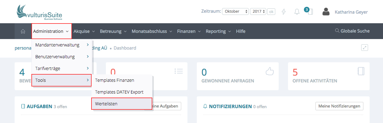 Um eine Werteliste zu bearbeiten, klicken Sie bitte auf der Startseite in der Menüleiste auf Administration -> Tools -> Wertelisten.