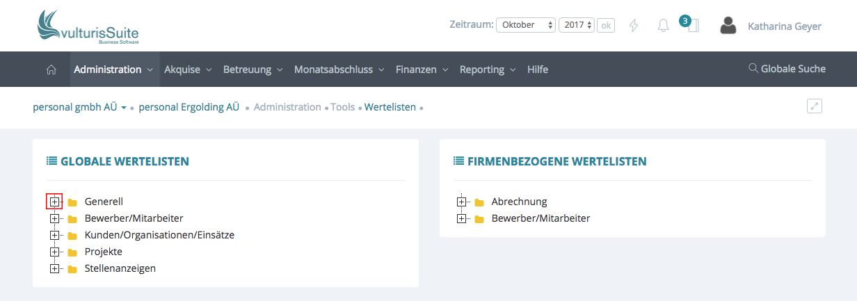 Die Seite Wertelisten erscheint. Aufgeteilt in globale und firmenbezogene Wertelisten.