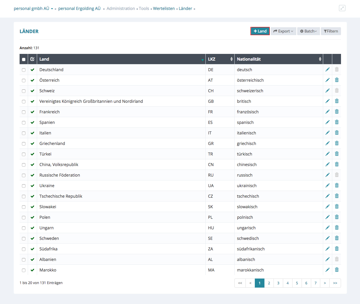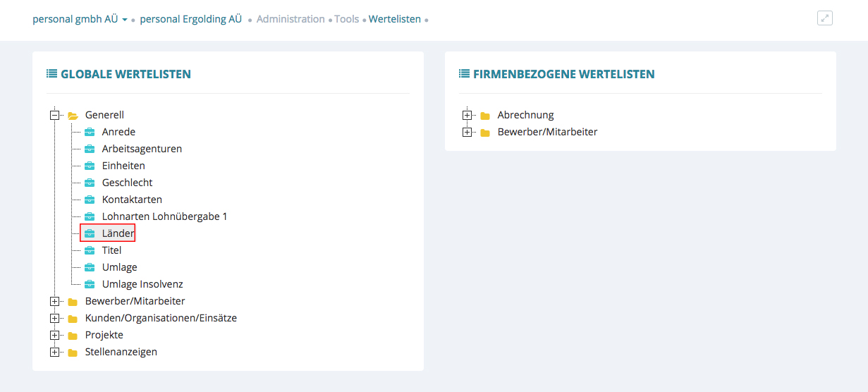 Gehen wir beispielsweise in die Werteliste Länder in dem Ordner „Generell“. Mit einem Klick auf den Unterordner „Länder“ gelangen sie direkt zu dessen Übersicht.