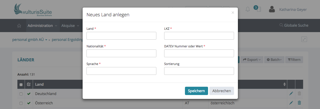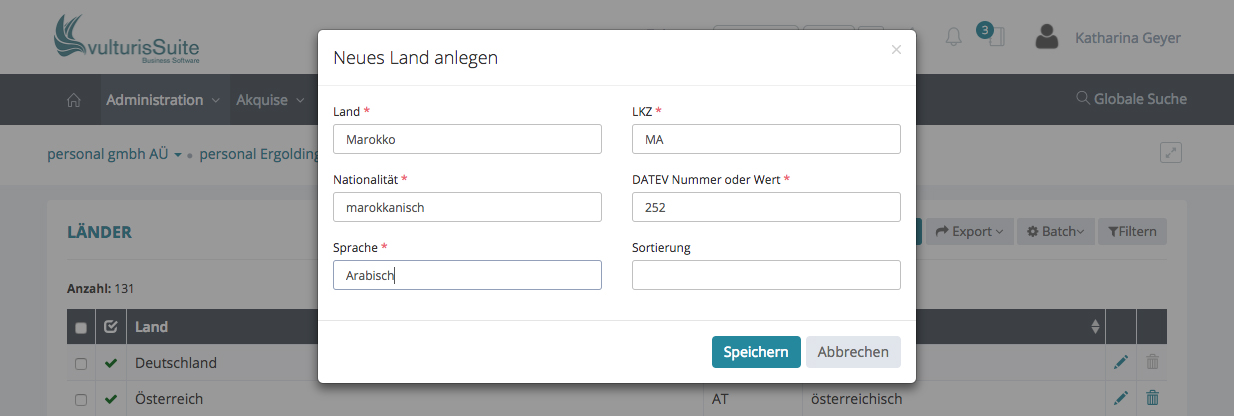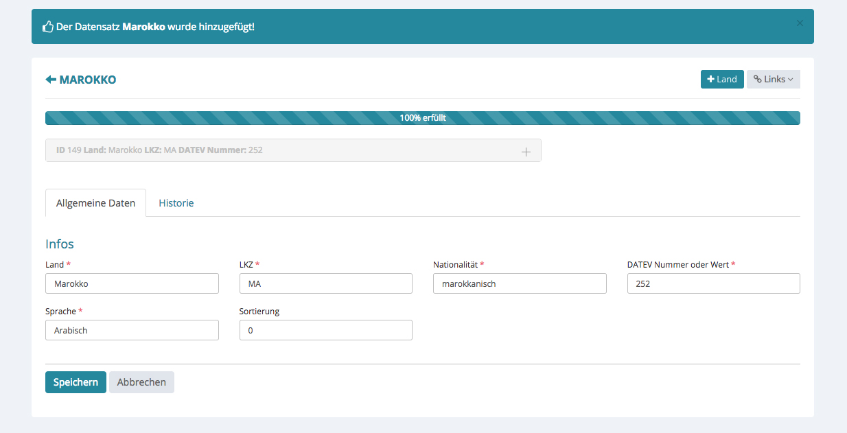 Die Sortierung erfolgt alphabetisch, kann aber individuell mit der Sortiernummer beeinflusst werden. Nach dem Ausfüllen der Pflichtfelder klicken Sie bitte auf speichern, anschließend gelangen Sie zum Formular. Gibt es bereits ein Land mit identischen Eingaben, ist ein erneutes anlegen nicht möglich!