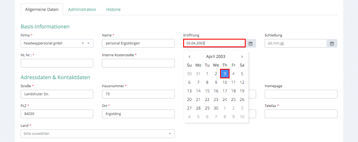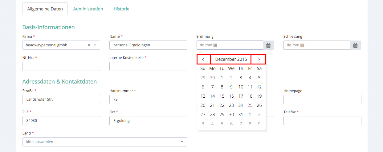Bewegen Sie sich nun über die Pfeile vor oder zurück in der Zeit, bis Sie im gewünschten Jahr und Monat der Eröffnung/Schließung sind. Mit einem Klick auf den ausgewählten Tag wird das Datum in das Feld eingetragen.
