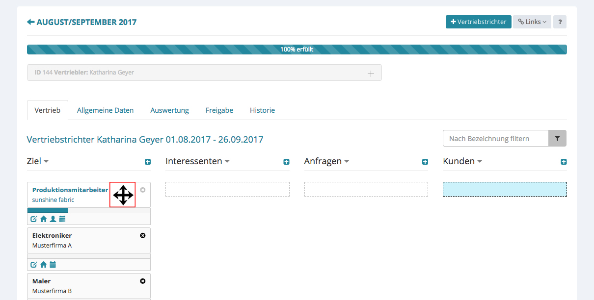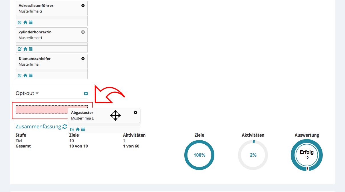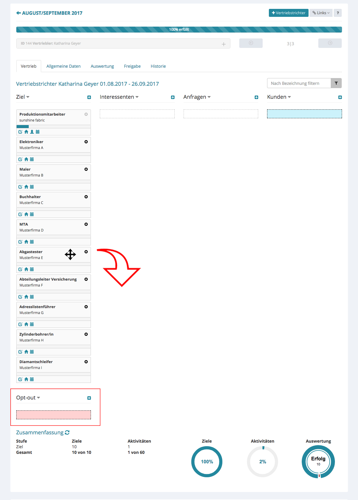 Leider kann es natürlich auch zu einer Ablehnung des Kunden kommen, dann wird das Ziel in die rote Rubrik „Opt-out“ gezogen.