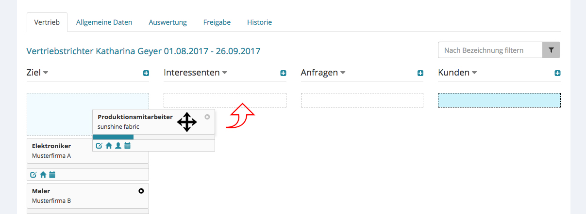 Bei „sunshine fabrics“ fand ein Besuch statt, der als weitere Aktivität angelegt wurde, das durch ein Interesse an einer Zusammenarbeit entstand. Damit kann das Ziel „sunshine fabric“ nun in die Rubrik „Interessenten“ verschoben werden.